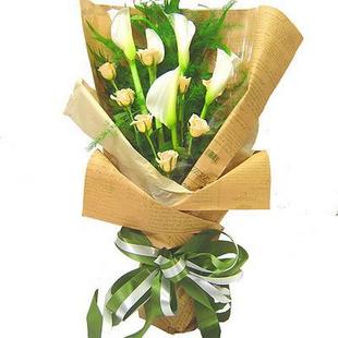 商品簡介:材料: 5支馬蹄蓮、粉色玫瑰、綠葉間插 包裝: 手揉紙豪華包裝