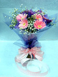 材 料: 扶郎8枝(顏色任意),滿天星豐滿 包 裝: 紫色綿紙單包,紫色透明包裝紙圓形包裝,粉色寬絲帶束扎。