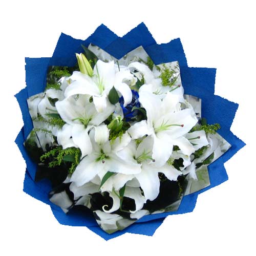 「材 料」 1枝藍色妖姬(國產),5枝白色香水百合,藍色綿紙包裝。
