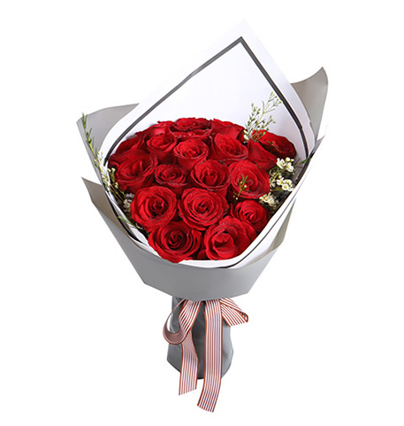 紅玫瑰19枝,石竹梅滿天星搭配,內層白底黑邊麗染紙,外層深灰色霧面紙,粉色絲帶束扎