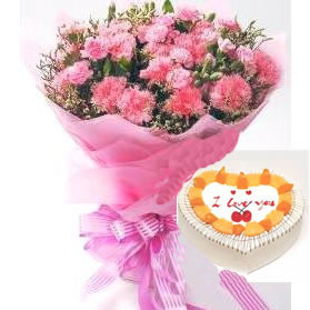 「材 料」 花材:12枝粉色康乃馨,;配草豐滿 ,蛋糕:鮮奶:8寸 「包 裝」 鮮花:粉色綿紙圓形包裝,同色蝴蝶結(jié)束扎 .蛋糕: 高檔蛋糕禮盒包裝。免費送一次性蛋糕用品一套(刀、叉、盤、蠟燭)