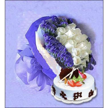 | 材料包裝: | 「材 料」 鮮花:11枝白色玫瑰、紫色勿忘我圍邊豐滿。蛋糕(8寸):水果,鮮奶,巧克力