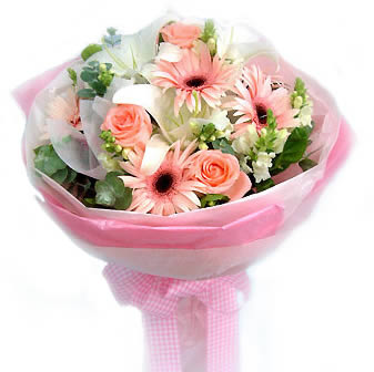 商品簡介:「材 料」 5朵粉紅玫瑰、5朵粉色扶郎、3朵香水百合、適量白色金魚草點綴 「包 裝」 粉色圓形包裝。