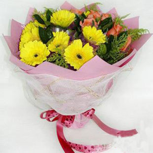 「材 料」 黃色非洲菊12枝,粉玫瑰8枝,點綴適量黃鶯和綠葉。 「包 裝」 粉色布紋紙圓形尖角包裝,外圍白色網紗,彩色絲帶.