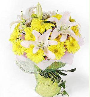 商品簡(jiǎn)介: 「材  料」 黃色扶郎18支,白色香水百合2支. 「包  裝」 淺粉色包裝紙圓形包裝,配綠色紗網(wǎng).