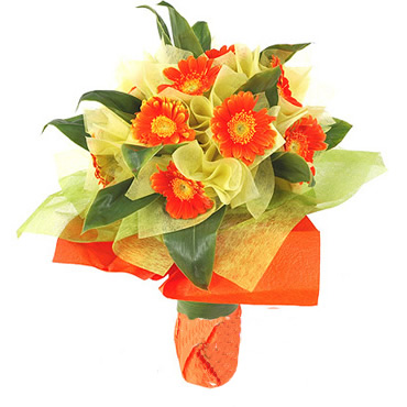 「材 料」 紅色扶郎花12支,每支淺橫色網(wǎng)紗單獨包裝,綠葉豐滿 「包 裝」 桔紅色皺紋紙圓形包裝