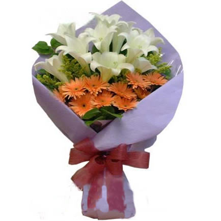 材料包裝: 「材  料」 10支桔色扶郎,8支鐵炮百合配綠葉 「包  裝」 淺紫色手揉紙單面包裝,深紅色云絲帶打結