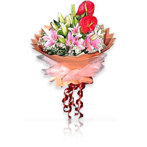 「材 料」 2枝紅掌,8枝香水粉百合,黃鶯,白色荷蘭菊 「包 裝」 香檳色皺紋紙,格紗網(wǎng)包裝,紅色絲帶束扎