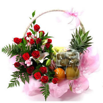 商品簡介:「材 料」 奇異果,蘋果,鮮橙,火龍果,鳳梨,圣女番茄等時令水果 「包 裝」 紅色玫瑰11枝,粉色香水百合1枝,排草等綠葉裝飾果籃
