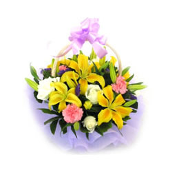 「材 料」 3支黃百合+3支粉色康乃馨+3支白色康乃馨+配葉 「包 裝」 精美花籃1個