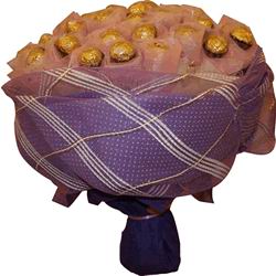 商品簡介:「材  料」 36粒金裝巧克力單獨包裝 「包  裝」 紫色皺紋紙,紗網圓形精美包裝