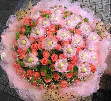 「材 料」 99枝粉玫瑰,19顆金莎巧克力(每顆巧克力加粉色小紗網),綠葉,滿天星 「包 裝」 粉色紗網圓形包裝,絲帶打結