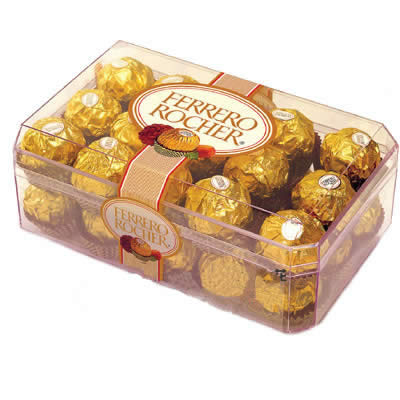 30粒裝,凈含量375G,每顆ROCHER選用金箔紙獨立包裝,陳列在透明禮盒內,意念新穎獨特,裝潢典雅華貴。盒蓋上燙金標貼須清楚印有的FERRERO ROCHER字樣。