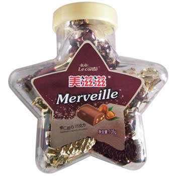 「材 料」 金帝美滋滋巧克力,榛仁脆心巧克力,105g 「包 裝」 五星形狀盒裝