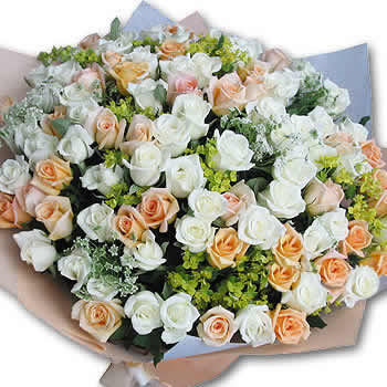 商品簡介: 「材  料」 66枝極品昆明白玫瑰,33枝極品昆明香檳玫瑰,綠草間插,淺紫色縐紋紙內襯,香檳色縐紋紙外圍圓形包裝,絲帶打結。