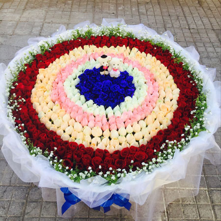 999支紅,香檳,粉,白,藍(lán)色妖姬混搭,2只小熊,滿天星黃鶯搭配,白色紗網(wǎng)圓形包裝,藍(lán)色蝴蝶結(jié)扎尾