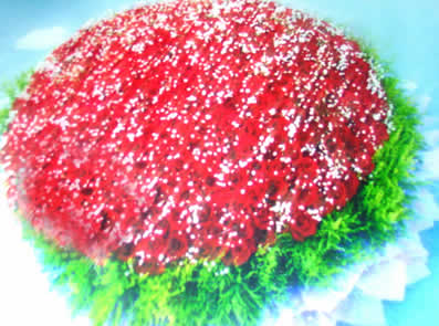 「材 料」 紅玫瑰999枝,黃鶯豐滿,滿天星點綴 「包 裝」 粉色皺邊紙圓形包裝