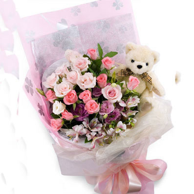 商品簡介:「材  料」 粉玫瑰11枝,淡香檳9枝,水仙百合點綴,小熊一只; 「包  裝」 淡粉色系棉紙、羽紗包裝,扇形花束。
