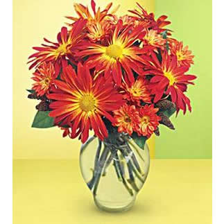 「材 料」 紅色非洲菊12枝、紅色小雛菊1扎 「包 裝」 縮口鼓肚玻璃花瓶1只<花瓶藝術(shù)插花>