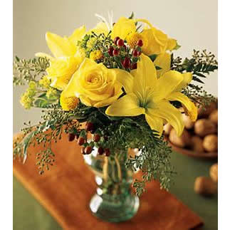「材 料」 黃百合3枝、黃色玫瑰5枝、黃色小雛菊間插