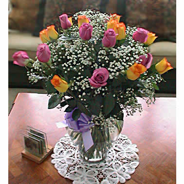 商品簡介: 「材  料」 桃紅色玫瑰花11枝、粉邊黃色彩玫瑰11枝、滿天星豐滿間插 「包  裝」 圓口鼓肚玻璃花瓶1只藕荷色蝴蝶結裝飾<花瓶藝術插花