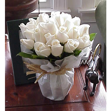 「材 料」 白色玫瑰花24枝、綠葉間插 「包 裝」 圓口梯形玻璃花瓶1只外包白色皺紋紙、葦草蝴蝶結(jié)裝飾<花瓶藝術(shù)插花>