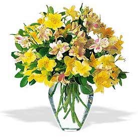 商品簡(jiǎn)介:黃粉水仙百合3扎 縮口鼓肚玻璃花瓶1只<花瓶藝術(shù)插花>