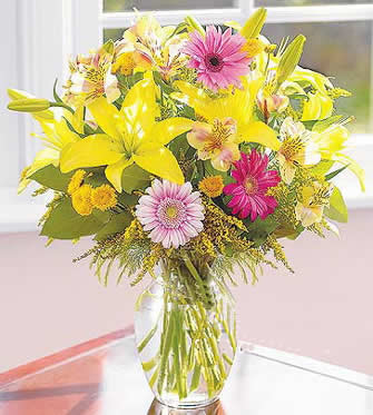 「材 料」 黃百合5枝,扶郎6枝,水仙百合、小菊、黃鶯適量 「包 裝」 玻璃瓶插花