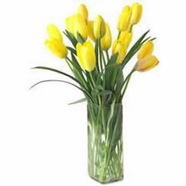 商品簡介:「材  料」 黃色郁金香19枝、劍葉 「包  裝」 方口方型玻璃花瓶1只<花瓶藝術插花>