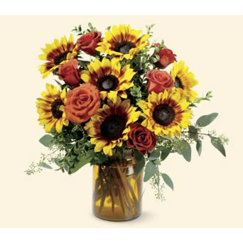 商品簡介: 「材 料」 橙色玫瑰9枝、向日葵9枝、梔子葉間插 「包 裝」 圓口圓柱型玻璃花瓶1只<花瓶藝術插花>