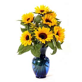 商品簡介: 「材 料」 向日葵10枝、黃鶯間插 「包 裝」 敞口鼓肚玻璃花瓶1只