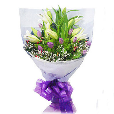 商品簡介:「材 料」 紫色郁金香11枝(特殊花材,需提前訂購),香水百合2枝,火龍果、滿天星點綴; 「包 裝」 扇形包裝