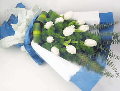 | 材料包裝: | 「材 料」 白色郁金香11枝、尤加利葉、巴西木葉、石松間插、