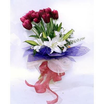「材 料」 深紅色郁金香10枝、白色多頭香水百合4枝