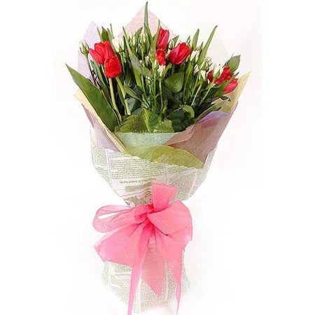 「材 料」 紅郁金香9支,白色多頭玫瑰0.5扎(或情人草,滿天是代替) 「包 裝」 淡紫、咖啡、淡綠、黃四色綿紙各1張3/4圓形包裝,上露四色角,深綠、花綠綿紙各1張兜底,玫紅色絲帶束扎