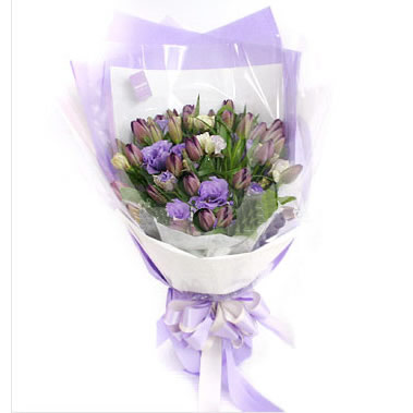 商品簡介: 「材  料」 紫色郁金香33朵、紫色桔梗 「包  裝」 透明玻璃紙內襯,白色棉紙,淺紫色