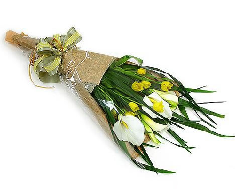 「材 料」 馬蹄蓮5支,郁金香11支,配蘭葉 「包 裝」 黃色皺紋紙標(biāo)準(zhǔn)包裝