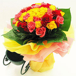 「材 料」 紅黃玫瑰各12支 「包 裝」 圓形包裝。黃色、粉色綿紙
