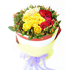 「材 料」 香檳玫瑰7枝,黃玫瑰7枝,紅玫瑰7枝,火龍珠豐滿。(如遇節令缺貨時,用水仙百合代替) 「包 裝」 圓形包裝。白色、紅色、黃色手揉紙