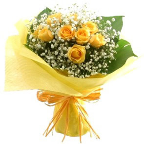 商品簡介: 「材  料」 黃色香水玫瑰9支、滿天星、綠葉,鮮花盛開了,愛情的果實成熟了! 「包  裝」 中圓形黃色包裝(黃色絲帶花)