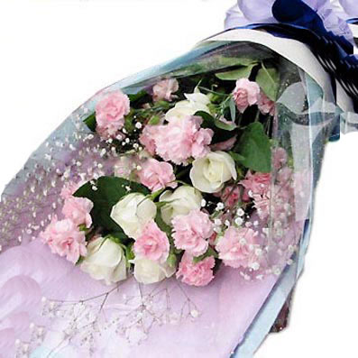 商品簡介: 「材 料」 19枝康乃馨、9枝白玫瑰、滿天星、綠葉 「包 裝」 淺色皺紋紙,法國結(jié)。