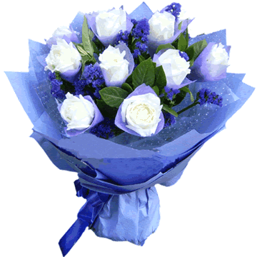 「材 料」 9支白玫瑰,內襯紫色勿忘我和綠葉 「包 裝」 深紫色皺紋紙包裝,同色蝴蝶結束扎成圓形花束