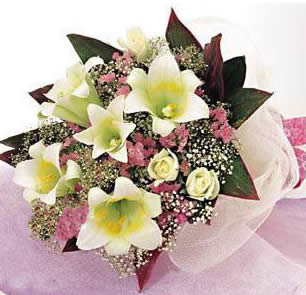 「材 料」 白色鐵炮百合6支,白色玫瑰6支、粉色勿忘我多支、配滿天星,綠葉點綴