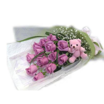 | 材料包裝: | 「材 料」 13枝精品紫玫瑰,加綠葉、滿天星點綴,5公分可愛小熊一只