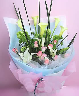 「材 料」 精品粉玫瑰11朵、高級多頭白香水百合1枝、靚麗的馬蹄蓮5枝,情人草、黃鶯 「包 裝」 內襯白紗, 內層為藍色縐紋紙,外層粉紅揉紙,白絲帶花結