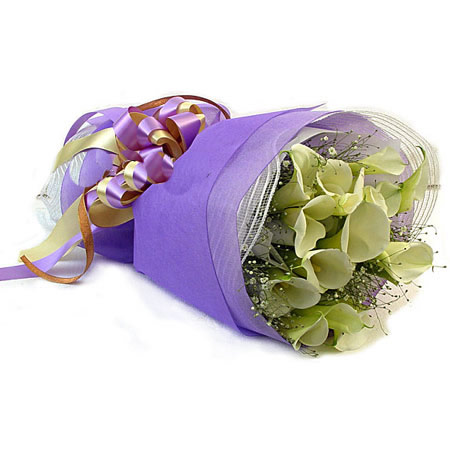 商品簡介:「材  料」 15枝馬蹄蓮,滿天星 「包  裝」 內襯白色玻璃紙,紫色縐紋紙外圍圓形包裝,絲帶打結。