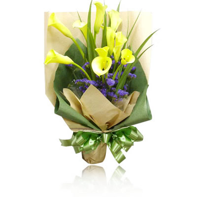 「材 料」 6支 馬蹄蓮 綠色和淡黃色南韓紙圓形束 「包 裝」 綠色和淡黃色南韓紙圓形束扎