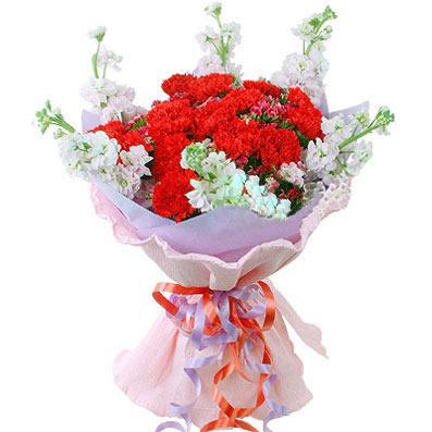 商品簡介:「材 料」 紅色康乃馨16支、白色紫羅蘭6支,石竹梅點綴。 「包 裝」 手揉紙、卷邊紙配合圓形包裝,雙色絲帶花束扎。