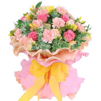 材料包裝: 「材  料」 香檳或粉色康乃馨12支,桃紅色玫瑰9支,香檳色龍膽、高山積雪、黃色小蒼蘭豐滿搭配。 「包  裝」 香檳色卷邊紙內(nèi)襯,外圍粉色卷邊紙,黃色法國結(jié)束扎。