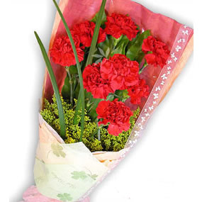 商品簡介:「材 料」 大紅康乃馨8支,配黃鶯、綠葉少許 「包 裝」 紅色皺紋紙,精美包裝成單面花束,內襯白色棉紙